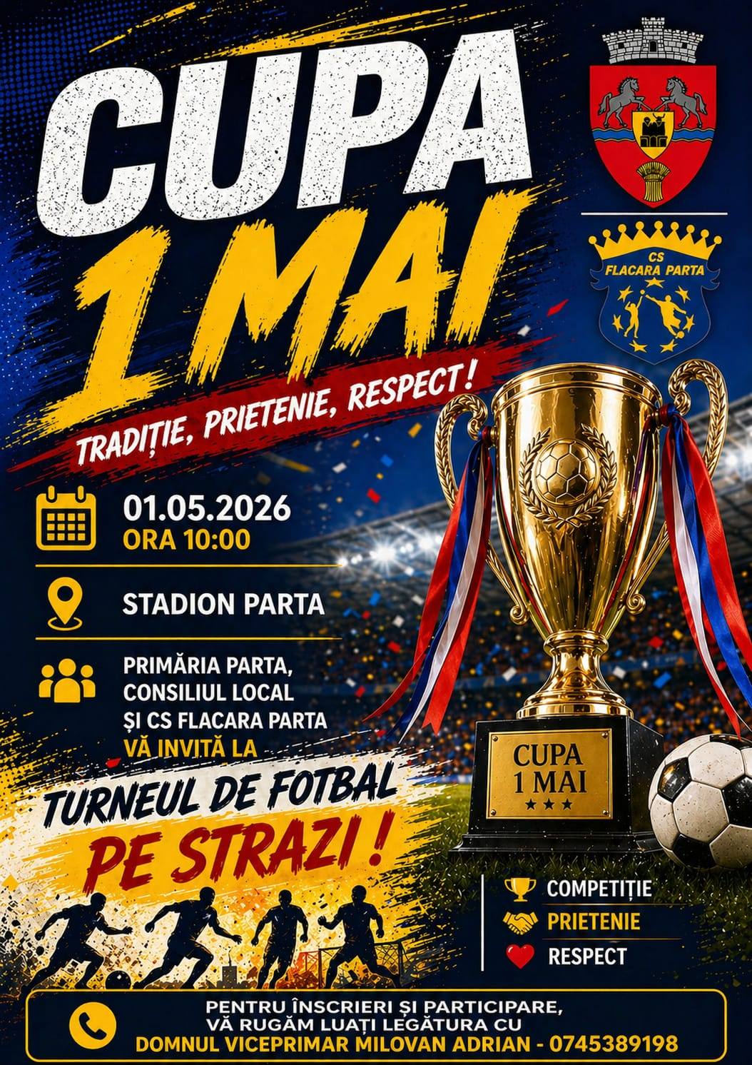 Ziua începe în forță cu „Cupa 1 Mai”, un turneu de fotbal pe străzi, organizat pe Stadionul Parța. Competiția va avea loc pe 1 mai 2026, de la ora 10:00 și aduce în prim-plan valorile sportului: competiție, prietenie și respect.