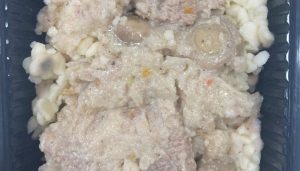 📸 Mâncarea servită pacienților: orez cu ciuperci și carne, cremă de brânză, pateu, unt și gem.